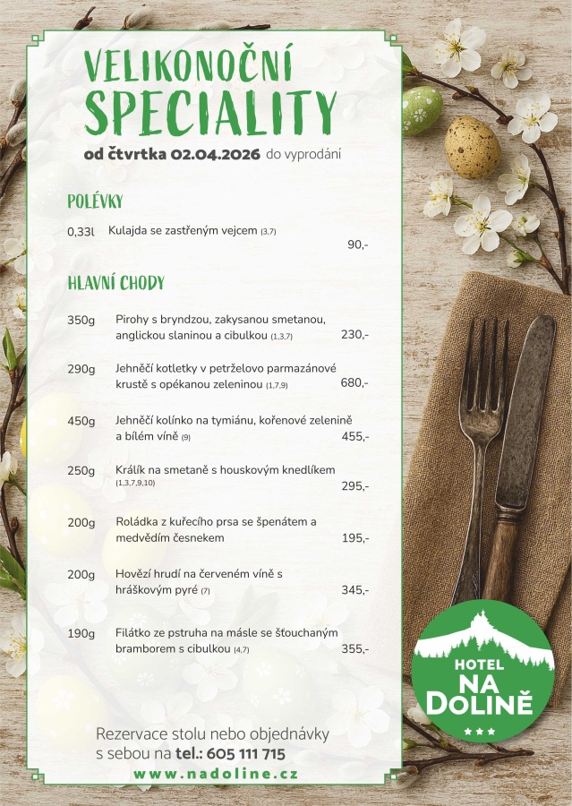 Velikonoce na Dolině oslavujeme výbornými specialitami. Přijďte si pochutnat na jídlech, která jsou inspirovaná jarní probouzející se přírodou. A také na zelené pivo!